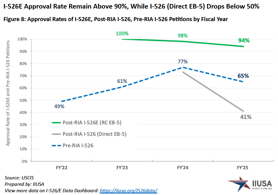 - Tỷ lệ chấp thuận I-526E đạt 94% trong FY2025. Đây là tín hiệu rõ ràng về lợi thế của mô hình Regional Center trong giai đoạn hiện tại.