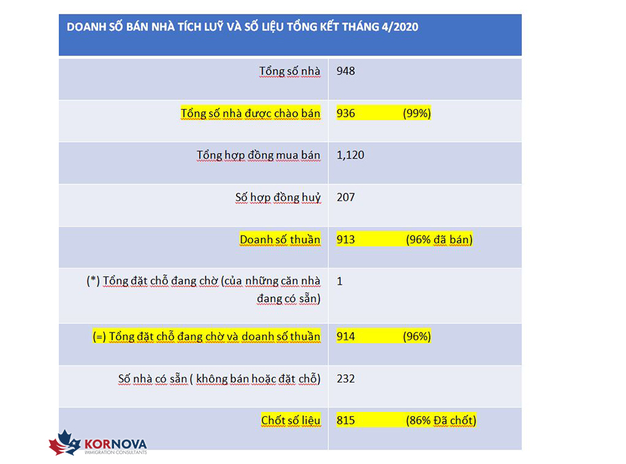 Tổng doanh số dự án tính đến cuối tháng 04 năm 2020: