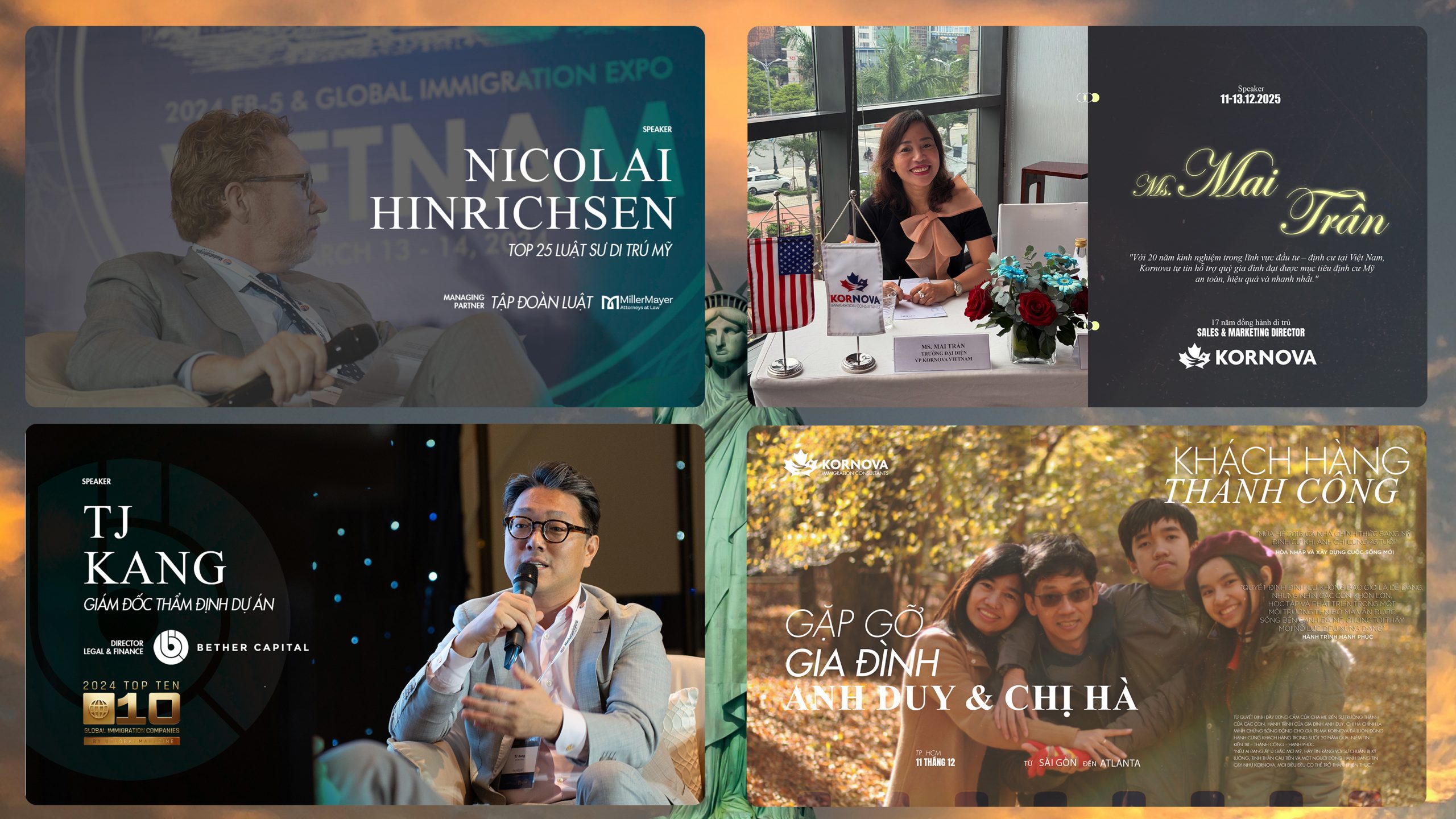 - Anh chị là khách hàng thành công của Kornova tham dự chia sẻ hành trình từ Sài Gòn đến Atlanta. Anh chị sẽ chia sẻ những câu chuyện thật, gần gũi và truyền cảm hứng từ quyết định thực hiện chương trình EB-5, cách thức hòa nhập cuộc sống, hành trình học tập, thích nghi của các con, kinh nghiệm thực tế giúp nhanh chóng an cư cho cả gia đình…