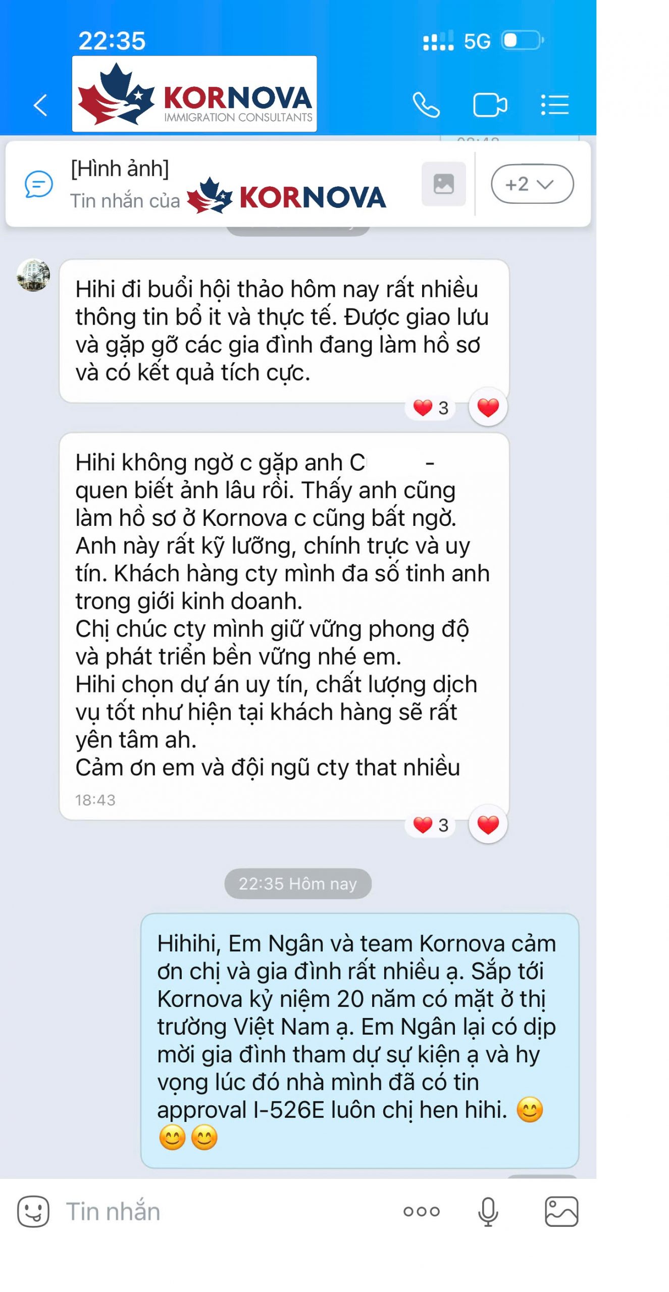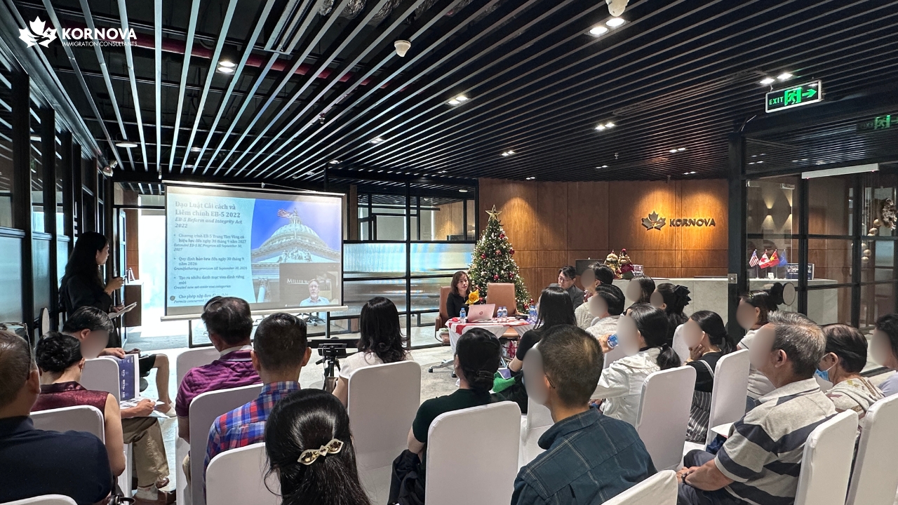 Trong hai ngày 12 và 13 tháng 12 năm 2025, chuỗi sự kiện do Kornova tổ chức đã mang đến nhiều thông tin mới nhất về chương trình EB-5, Thẻ Vàng Gold Card, tư vấn trực tiếp cùng các Luật sư hàng đầu, cũng như lắng nghe chia sẻ từ những người thành công đi trước, từ đó mở ra hành trình định cư Mỹ an toàn và vững chắc cho các gia đình Việt Nam. Các khách hàng tham dự đều rất tâm đắc và đánh giá cao giá trị thông tin mà hội thảo đã mang lại.