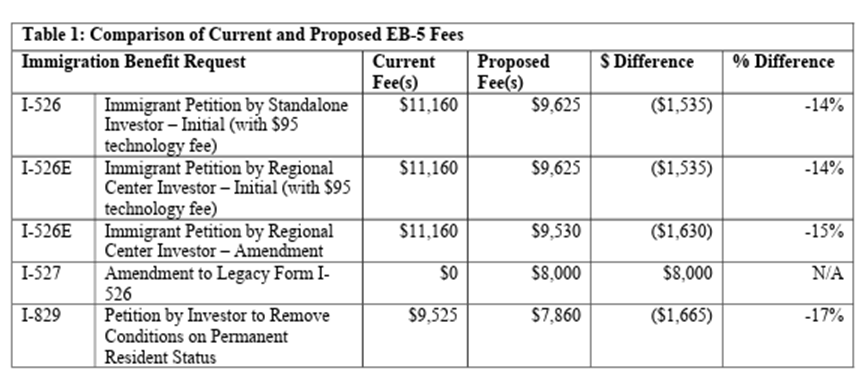 Giảm phí đơn I-526/I-526E (đơn đầu tiên khi nhà đầu tư nộp hồ sơ EB-5) từ 11,160 USD xuống 9,530 USD, đồng thời áp dụng phí công nghệ mới 95 USD để cải thiện hệ thống xử lý hồ sơ.