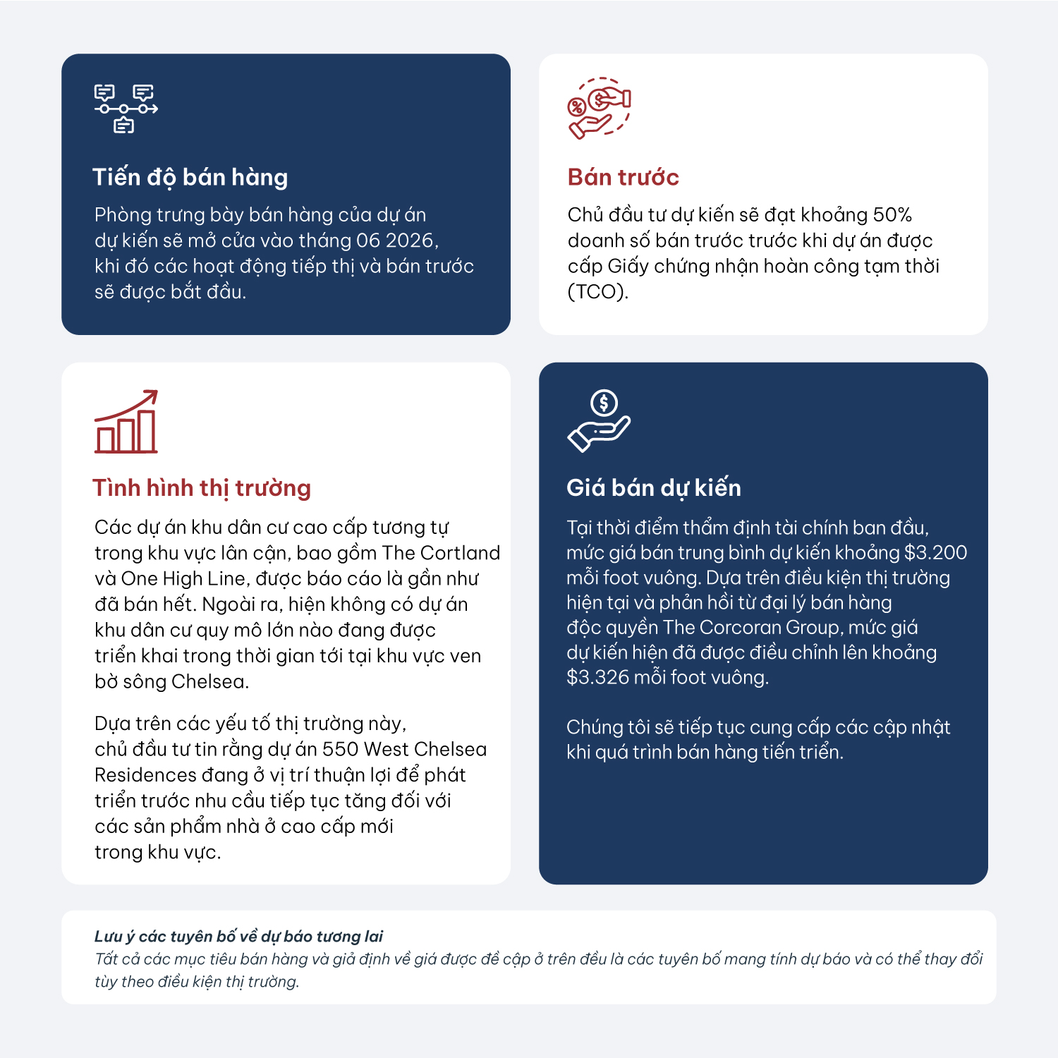 Bên dưới là tóm tắt về tiến độ bán hàng dự kiến của 550 West Chelsea Residences và tình hình thị trường hiện tại: