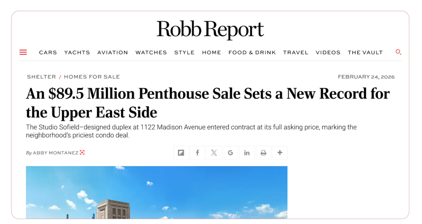 Trong một báo cáo gần đây, các dự án bất động sản cao cấp do Legion Investment Group phát triển đã chứng minh sức hút mạnh mẽ trên thị trường, với một hợp đồng bán căn penthouse trị giá $89,5 triệu tại 1122 Madison Avenue, và 20/26 căn hộ đã được giao dịch thành công ngay khi dự án vừa ra mắt.
