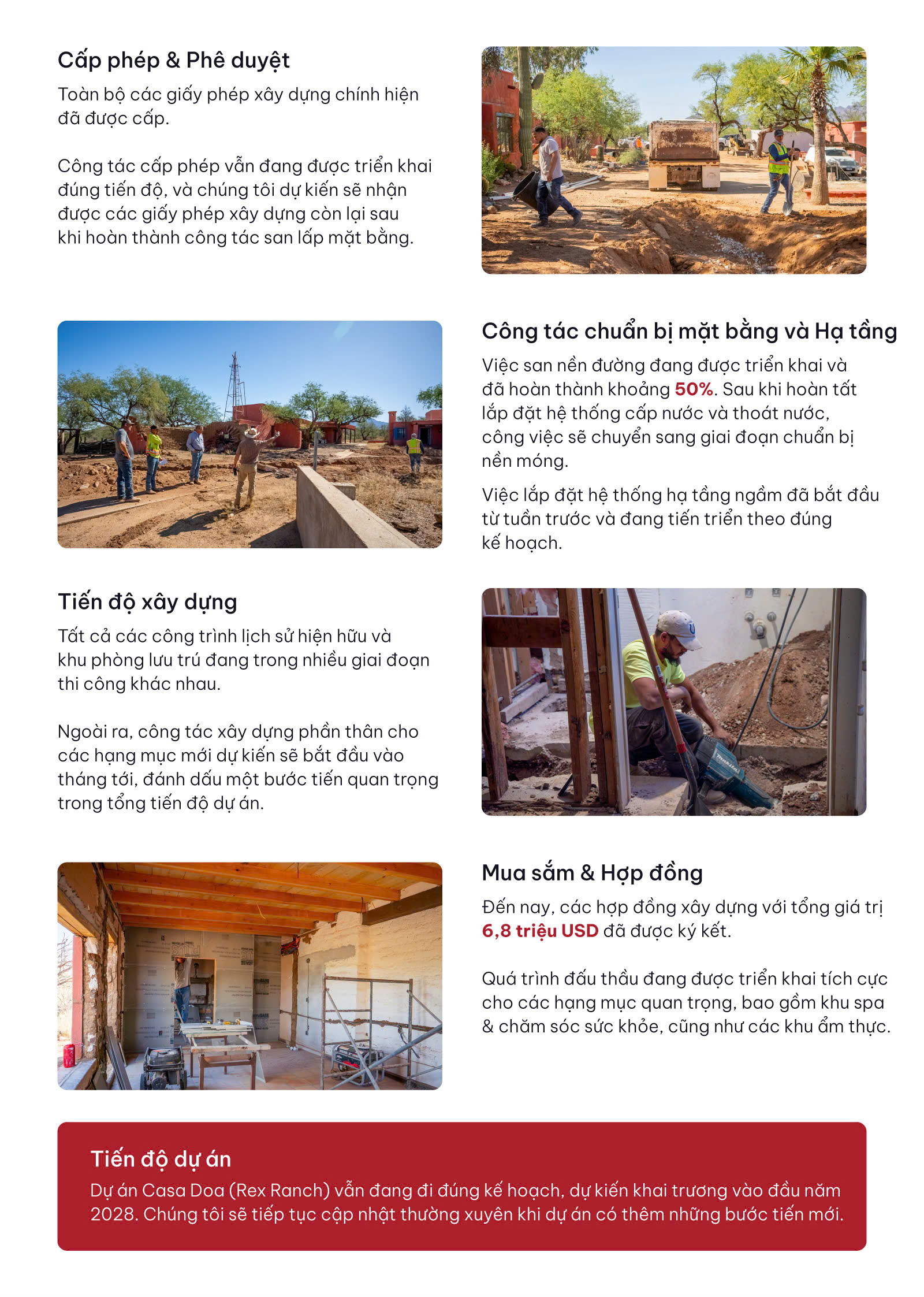 Dự án Casa Doa vẫn đang được xây dựng theo đúng kế hoạch, dự kiến khai trương vào đầu năm 2028. 90% nhà đầu tư vào dự án Casa Doa đã nhận được phê duyệt đơn I-526E, và 11 nhà đầu tư đã nhận được Thẻ Xanh với thời gian xét duyệt nhanh nhất chỉ trong vòng 8 tháng.