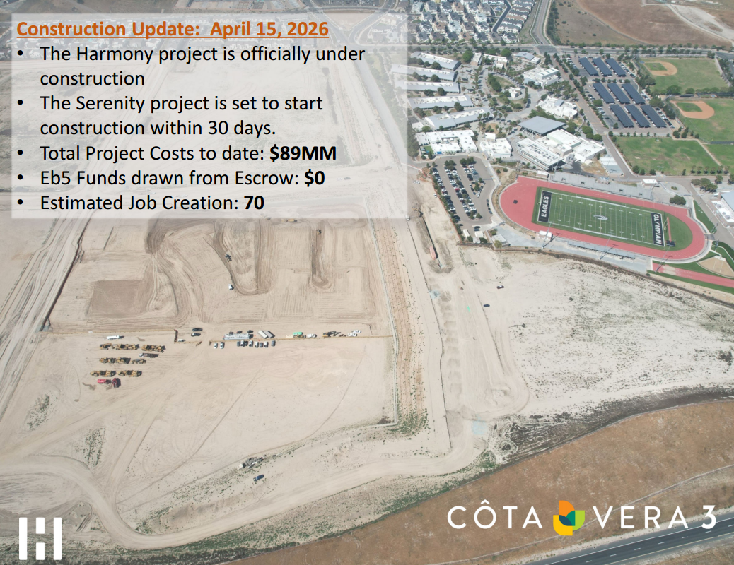 Chuỗi dự án Cota Vera, Cota Vera 2 và 3 là các dự án thuộc khu quy hoạch đô thị tọa lạc tại thành phố Chula Vista, khu vực Otay Ranch ở San Diego, California. Đây là các dự án EB-5 thuộc một trong những cộng đồng quy hoạch dân cư lớn và thành công nhất tại Mỹ. Kornova xin gửi đến quý Anh/Chị các cập nhật mới nhất về dự án Cota Vera và Cota Vera 2, 3 đến ngày 15 tháng 4 năm 2026.