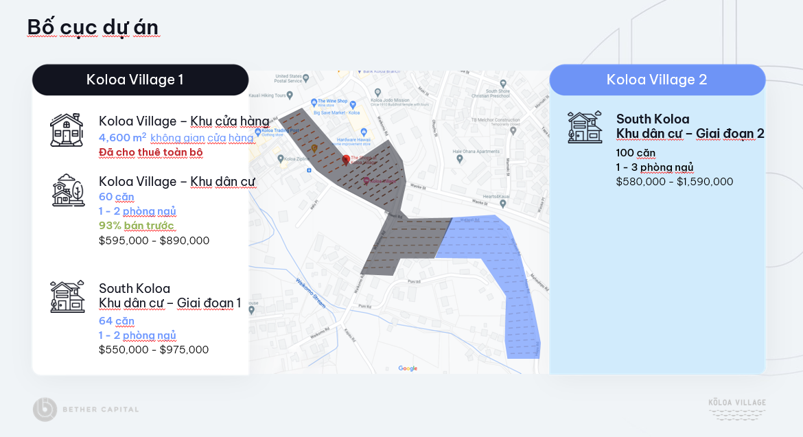 Tọa lạc tại thị trấn đồn điền lịch sử Koloa, Koloa Village là dự án phát triển địa ốc đầu tiên về thương mại dân cư dạng này ở Kauai. Một khu đô thị đa chức năng thực thụ, Koloa Village là hiện thân cho triết lý “sống – làm việc – giải trí” trong một không gian thân với người đi bộ và kết nối cộng đồng. Giai đoạn 1 của dự án bao gồm: khu vực cửa hàng với diện tích 4.600m2 đã hoàn công, 60 căn tại khu dân cư Koloa Village, và 64 căn tại khu dân cư South Koloa Town. Giai đoạn 2 sẽ tiến hành xây dựng tiếp tục 100 căn tại khu dân cư South Koloa Town, khởi công vào tháng 9/2026 và dự kiến hoàn công vào tháng 10/2029.