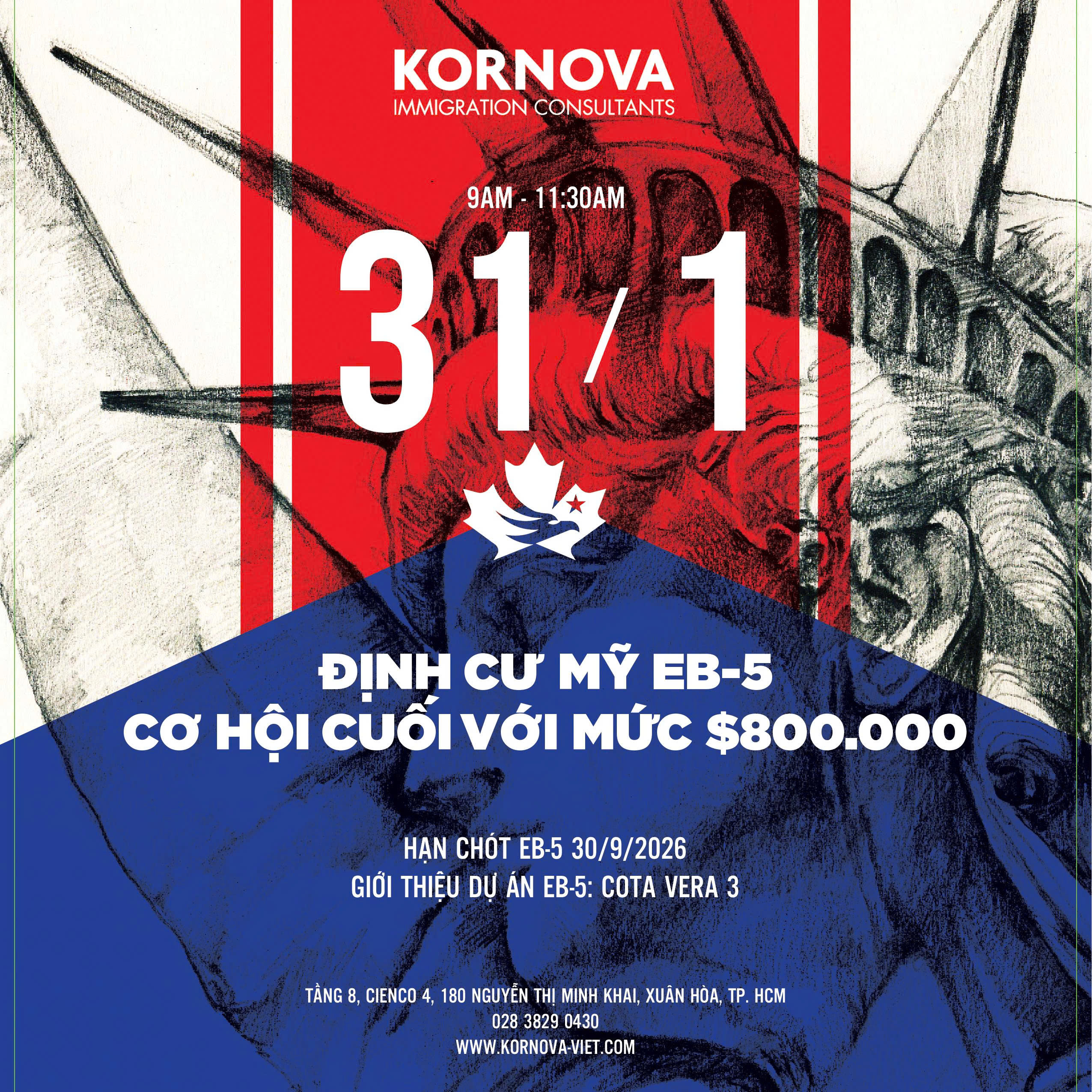 Nhằm cập nhật thông tin và hỗ trợ nhà đầu tư trong giai đoạn quan trọng này, Kornova tổ chức Hội thảo Định cư Mỹ EB-5 – Cơ hội cuối với mức $800.000 với các nội dung trọng tâm, tập trung vào tính khả thi và an toàn của hồ sơ.