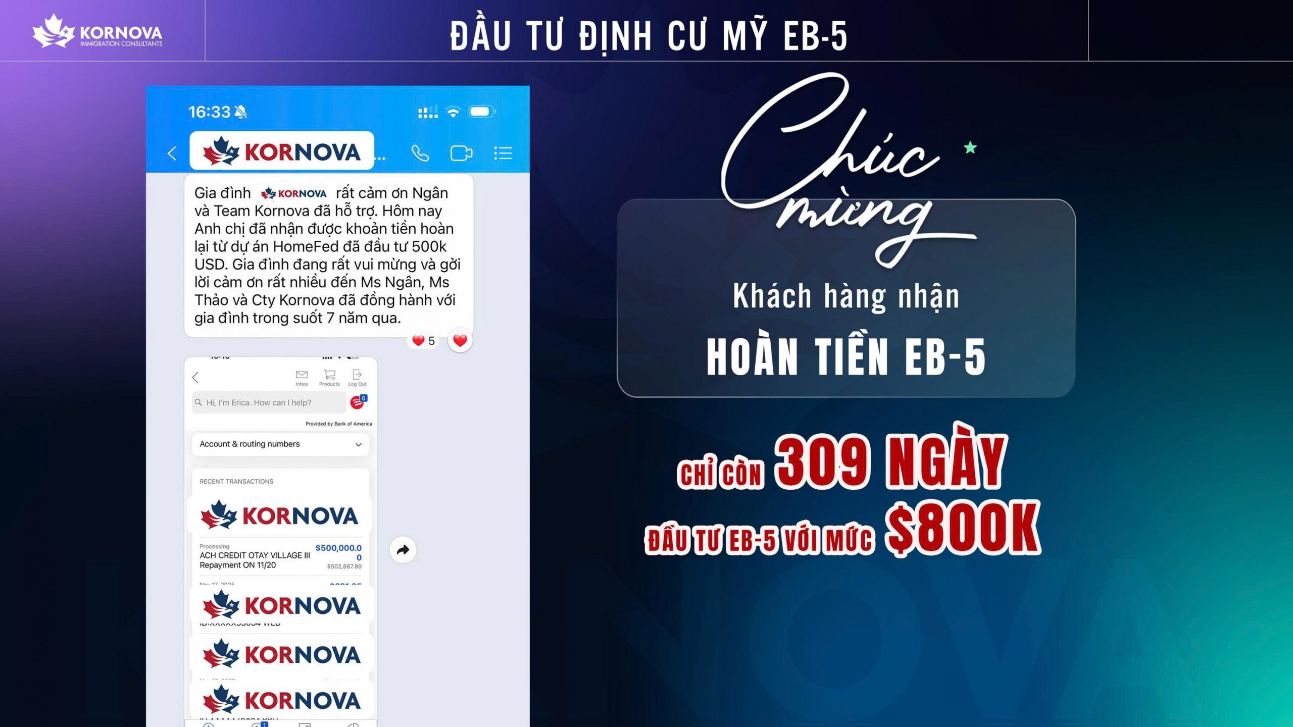 Kornova xui mừng thông báo thêm một gia đình khách hàng EB-5 – anh H. vừa chính thức nhận được khoản hoàn vốn 500.000 USD từ dự án Escaya, khép lại trọn vẹn hành trình định cư Mỹ sau 7 năm đồng hành cùng Kornova.