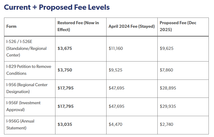 - Phí EB-5 có thể thay đổi lại vào tháng 12/2025: DHS sẽ lấy ý kiến công chúng cho biểu phí mới, biểu phí cuối cùng có thể điều chỉnh lại so với đề xuất hiện tại, dự kiến sẽ có hiệu lực vào tháng 12/2025.