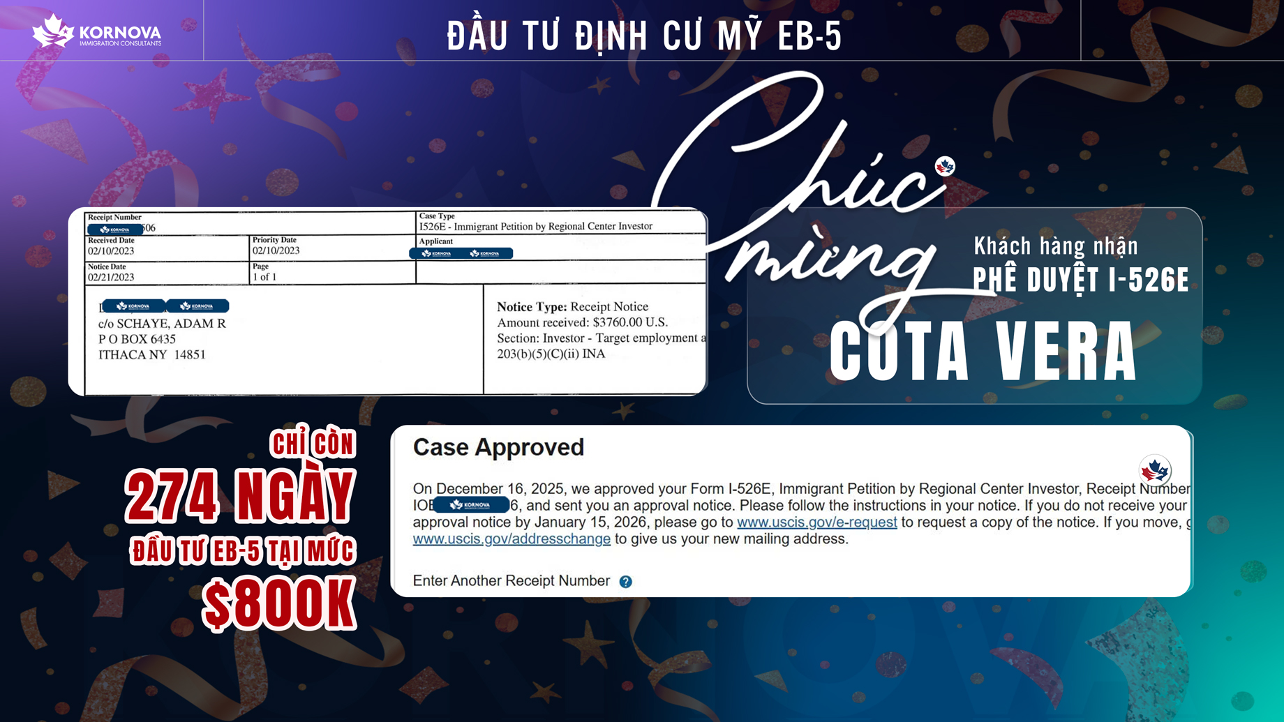 Kornova cũng xin chia sẻ thêm một tin vui nữa đến từ gia đình anh Đ – nhà đầu tư EB-5 dự án Cota Vera cũng đã nhận phê duyệt đơn I-526E sau 2 năm 10 tháng xét duyệt hồ sơ. Mến chúc gia đình anh sẽ sớm nhận thêm nhiều tin vui nữa trong hành trình tiến đến Thẻ Xanh Mỹ của cả nhà.