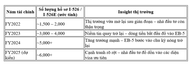Dữ liệu gần đây do USCIS công bố và các phân tích trong ngành cũng cho thấy nhu cầu đầu tư vào chương trình EB-5 đã phục hồi kể từ khi RIA được ban hành. Bảng dưới đây thể hiện sự quan tâm của các nhà đầu tư đối với chương trình EB-5 qua các năm tài chính.